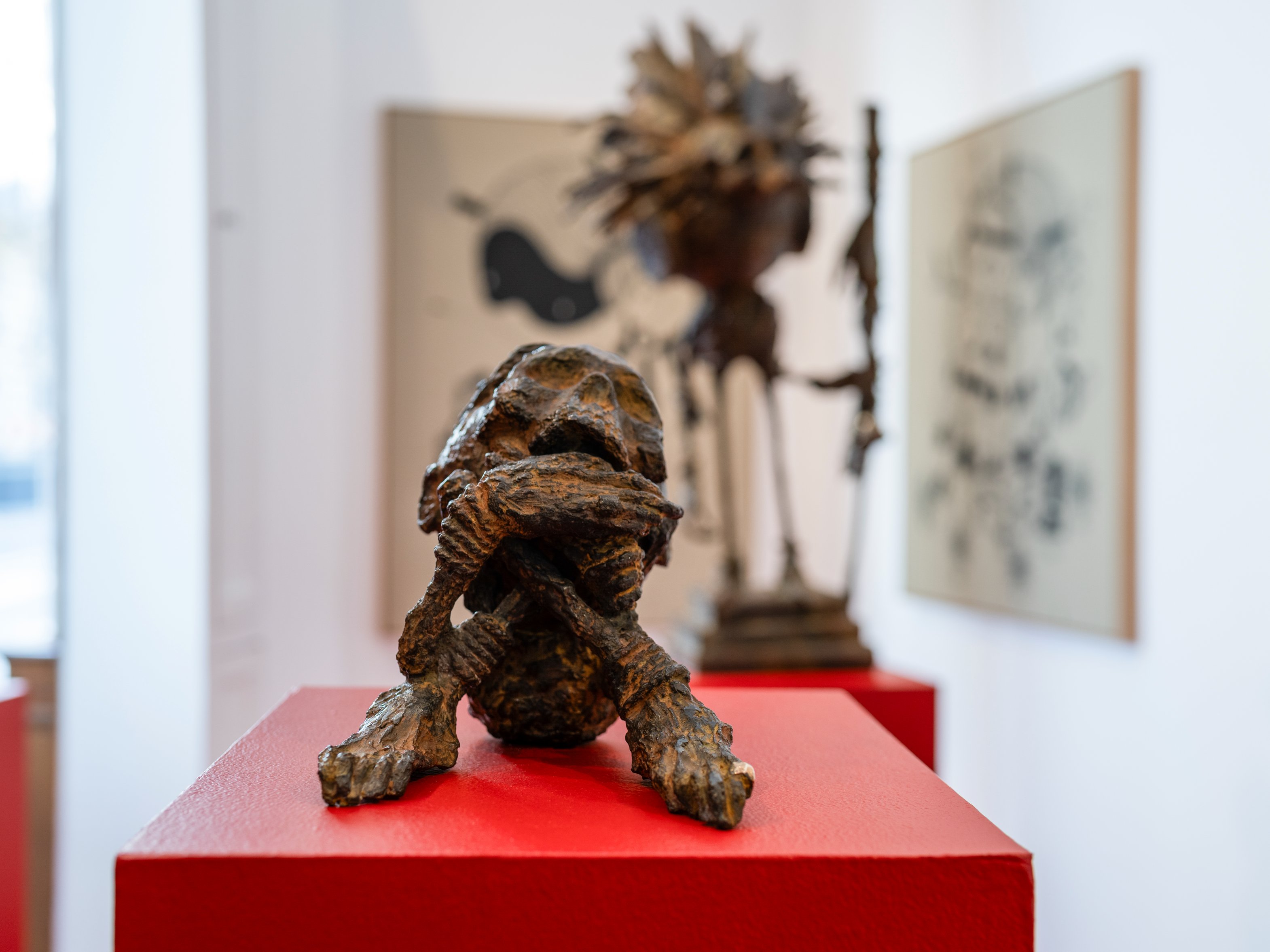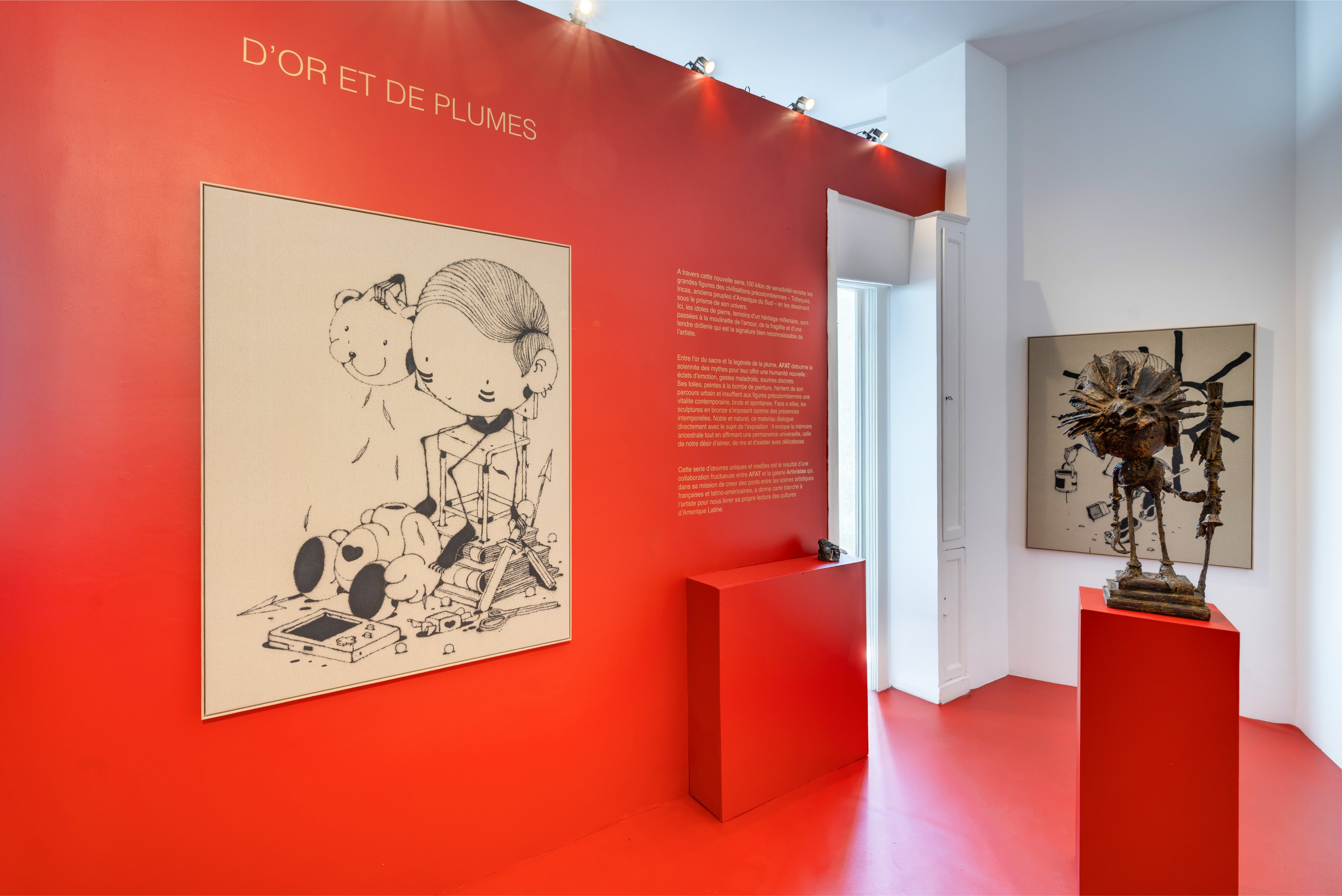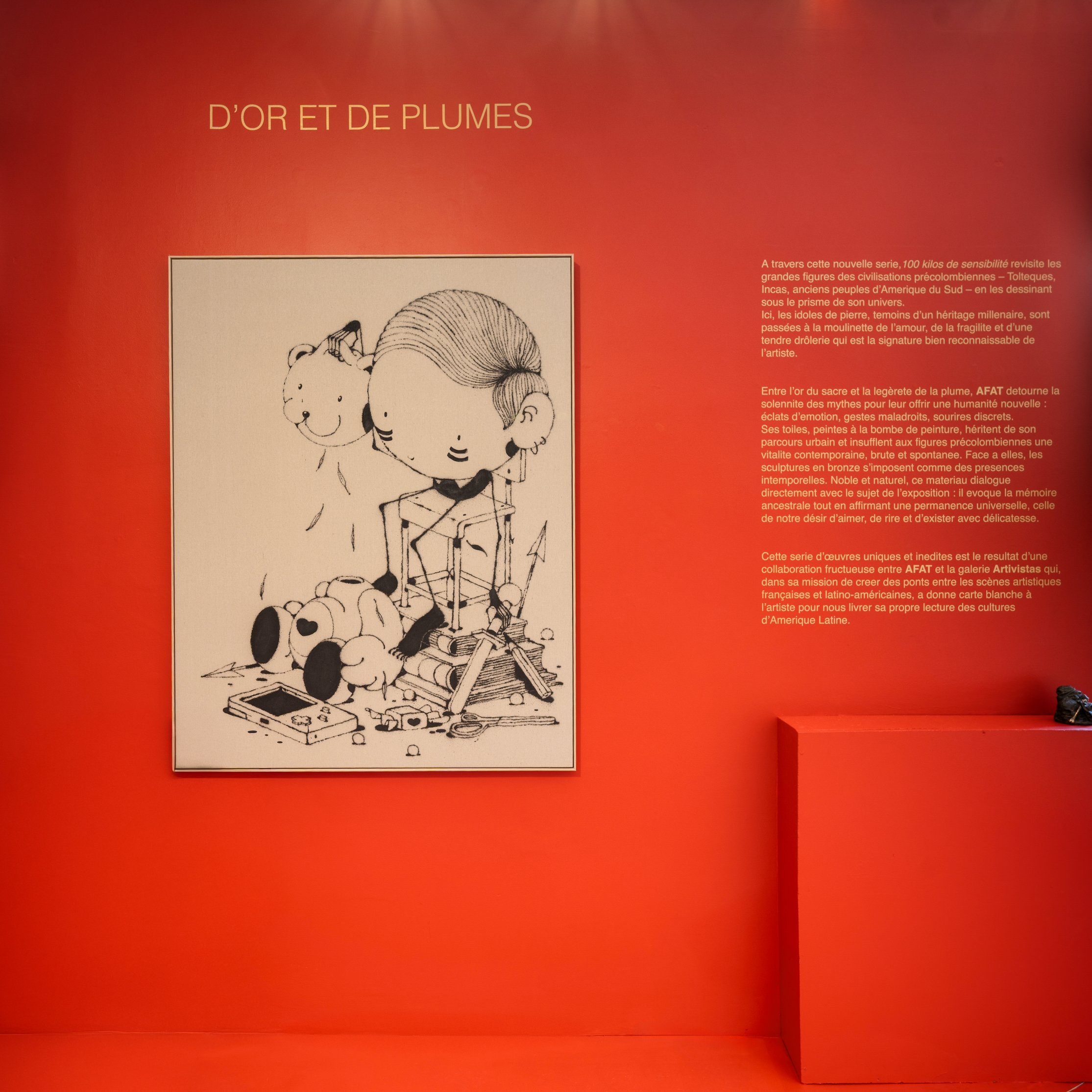 Ses toiles, peintes à la bombe de peinture, héritent de son parcours urbain et insufflent aux figures précolombiennes une vitalité contemporaine, brute et spontanée. Face à elles, les sculptures en bronze s’imposent comme des présences intemporelles. Noble et naturel, ce matériau parle directement avec le sujet de l’exposition : il évoque la mémoire ancestrale tout en affirmant une permanence universelle, celle de notre désir d’aimer, de rire et d’exister avec délicatesse. Cette série d’œuvres uniques et inédites est le résultat d’une collaboration fructueuse entre AFAT et la galerie Artivistas qui, dans sa mission de créer des ponts entre les scènes artistiques françaises et latino-américaines, a donné carte blanche à l’artiste pour nous livrer sa propre lecture des cultures d’Amérique Latine.